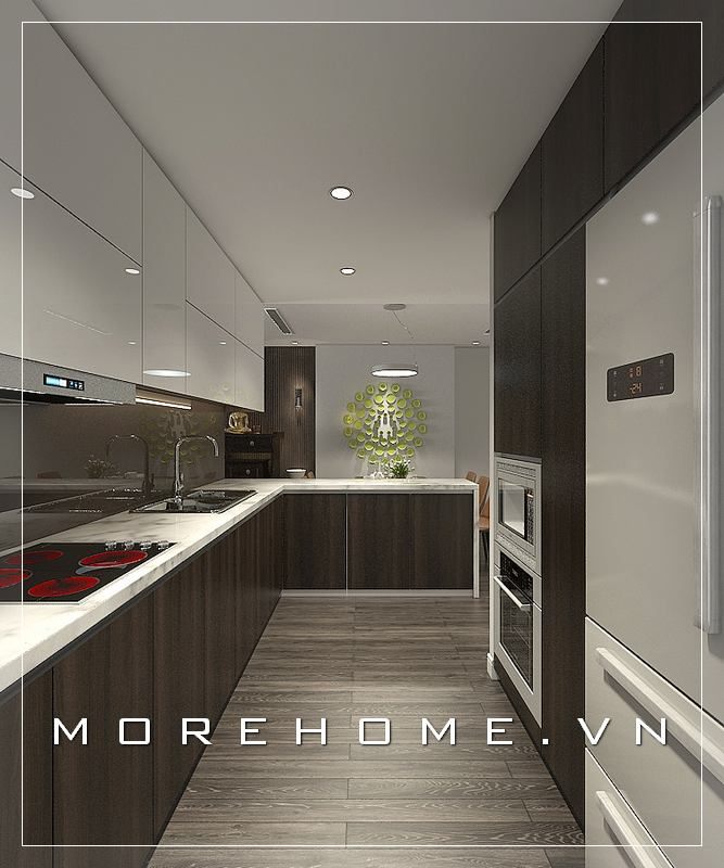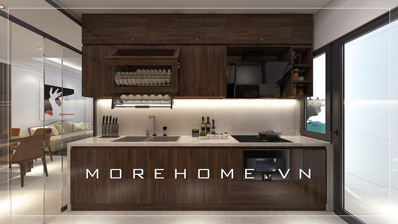 Thiết kế tủ bếp chung cư cao cấp với chất liệu gỗ óc chó nhập khẩu đóng vai trò chủ đạo tạo nên sự sang trọng, tinh tế, đồng thời thể hiện được sự đẳng cấp, gu thẩm mỹ của chủ nhân ngôi nhà