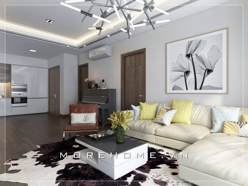 Lựa chọn bộ sofa hiện đại thoáng đãng lại sang trọng với chất liệu da bọc cao cấp cho phòng khách căn hộ chung cư thêm ấn tượng.