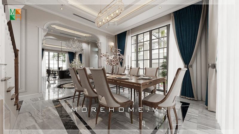 Tâm điểm của không gian phòng ăn biệt thự, nhà phố cao cấp là mẫu bàn ăn gỗ óc chó cao cấp kết hợp vỏ bọc da màu trắng sang trọng ấn tượng.