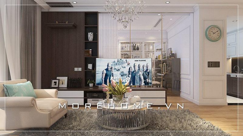 Trang trí phòng khách biệt thự Vinhomes Greenbay sang trọng với sản phẩm kệ trang trí kệ decor bằng gỗ óc chó