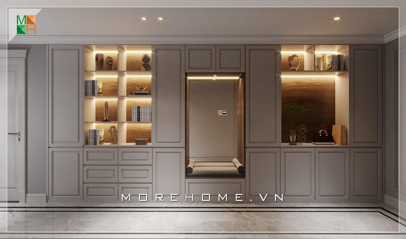 Thiết kế kệ trang trí, kệ tủ đồ cao cấp thiết kế sáng tạo âm tường kịch sàn vừa đảm bảo tính thẩm mỹ và rất tiện ích cho biệt thự, chung cư, nhà phố.