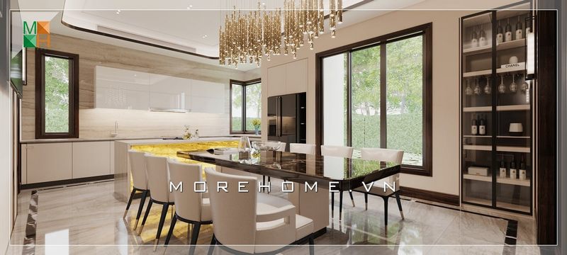 Gợi ý mẫu cửa kính được sử dụng khá phù hợp từ các cửa sổ tạo độ thông thoáng và tiện nghi cho không gian phòng ăn biệt thự, nhà phố sang trọng.