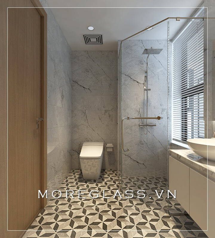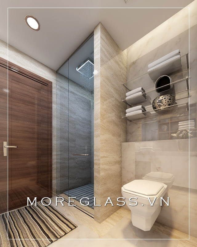 Mẫu thiết kế nhà tắm đẹp, nổi bật với vách kính đứng hiện đại giúp tách biệt hai không gian căn phòng và phòng tắm.