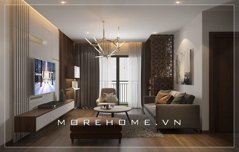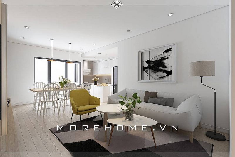 . Nội thất phòng khách của căn hộ chung cư được sắp xếp một cách hợp lí, có kiểu dáng vintage hiện đại, mang lại một không gian sinh hoạt đơn giản, thanh lịch và tiện nghi.