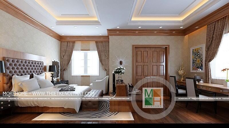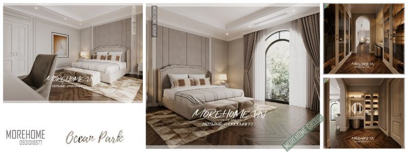 Phòng ngủ master được thiết kế với nội thất tân cổ điển bằng gỗ tự nhiên cao cấp, mang đến sự sang trọng.