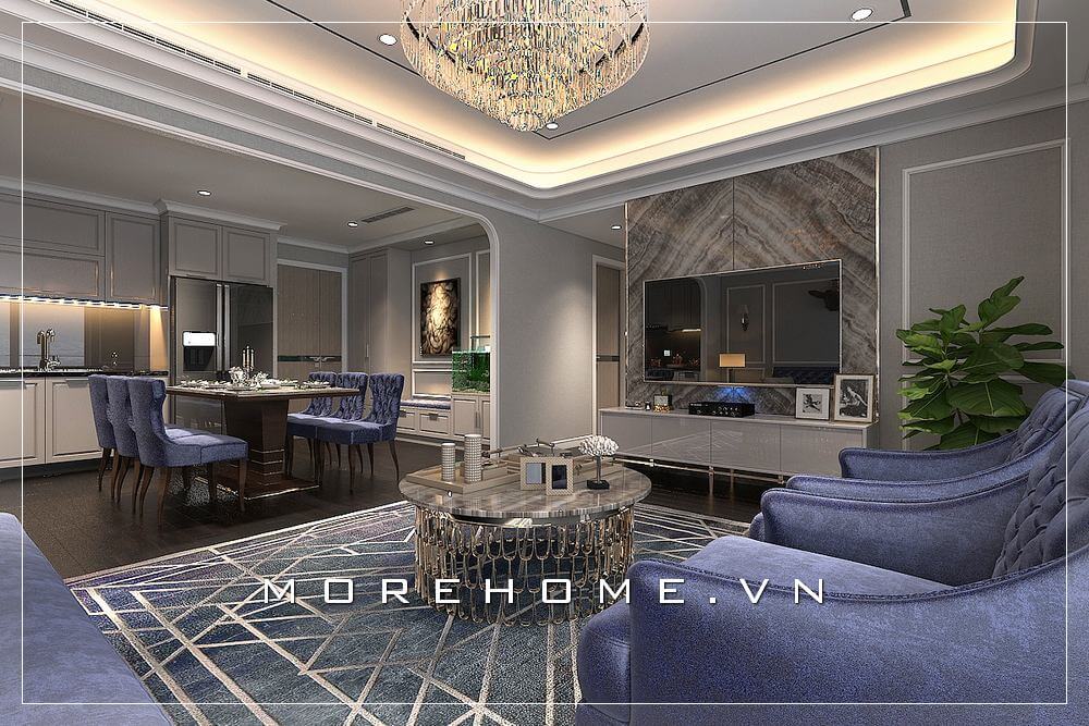 Thiết kế nội thất phòng khách chung cư cao cấp phong cách tân cổ điển sang trọng tạo cảm giác quý phái và đẳng cấp