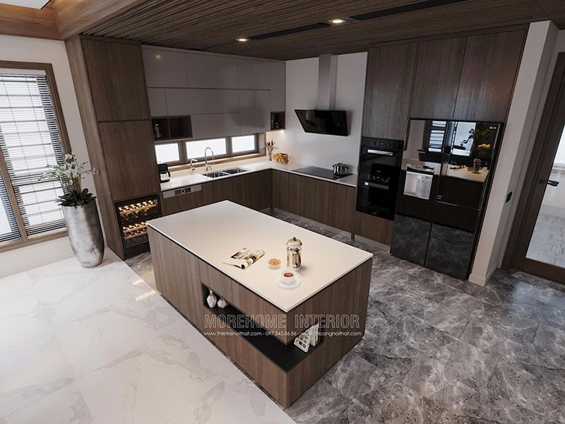 Thiết kế nội thất phòng bếp biệt thự gỗ tự nhiên sang trọng sử dụng tone màu nâu trầm ấm cúng và tiện nghi cho không gian biệt thự