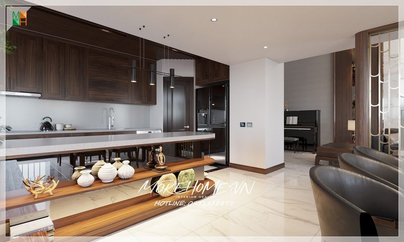 Với tone màu gỗ trầm ấp, tinh tế, không gian nội thất phòng bếp chung cư trông vô cùng trẻ trung và hiện đại
